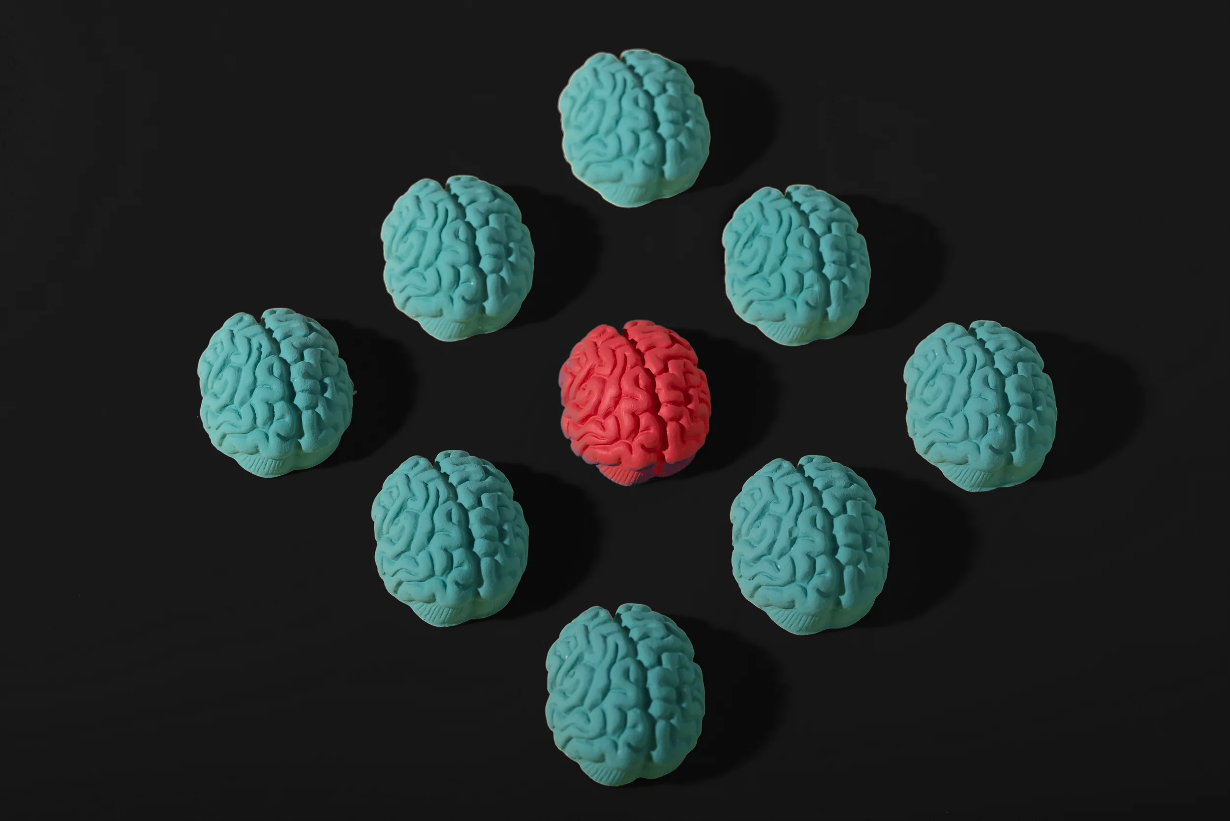 The image shows nine brains in a square, arranged in three rows of three. The middle brain is bright pink, and the rest are teal placed on a black background.